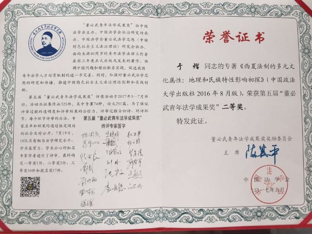 “董必武青年法学成果奖”是由中国法学会主办,中国法学会法治研究所承办,中国法学会董必武法学思想(中国特色社会主义法治理论)研究会协办的部级奖励,面向未满40周岁的青年法学法律工作者正式出版或发表的著作,是中国青年法学研究成果的最高奖项。本届终评专家由陈冀平、张文显、王其江等18位著名专家学者组成,在325件作品中遴选出一等奖作品1件、二等奖作品5件、三等奖作品10件、提名奖作品17件。于熠博士的专著《西夏法制文化的多元文化属性:地理和民族特性影响初探》在三百余件作品中脱颖而出,荣获二等奖,也是历届作品中唯一一件获奖的法律史学作品。终评委员会对于熠博士的作品给出的获奖理由为“首次对西夏法律文化的民族和地理特色进行了系统研究,较深入地阐释了西夏法制的‘多元文化属性’,史料翔实,颇有见地”,高度评价了于熠博士的学术功底和研究视角。