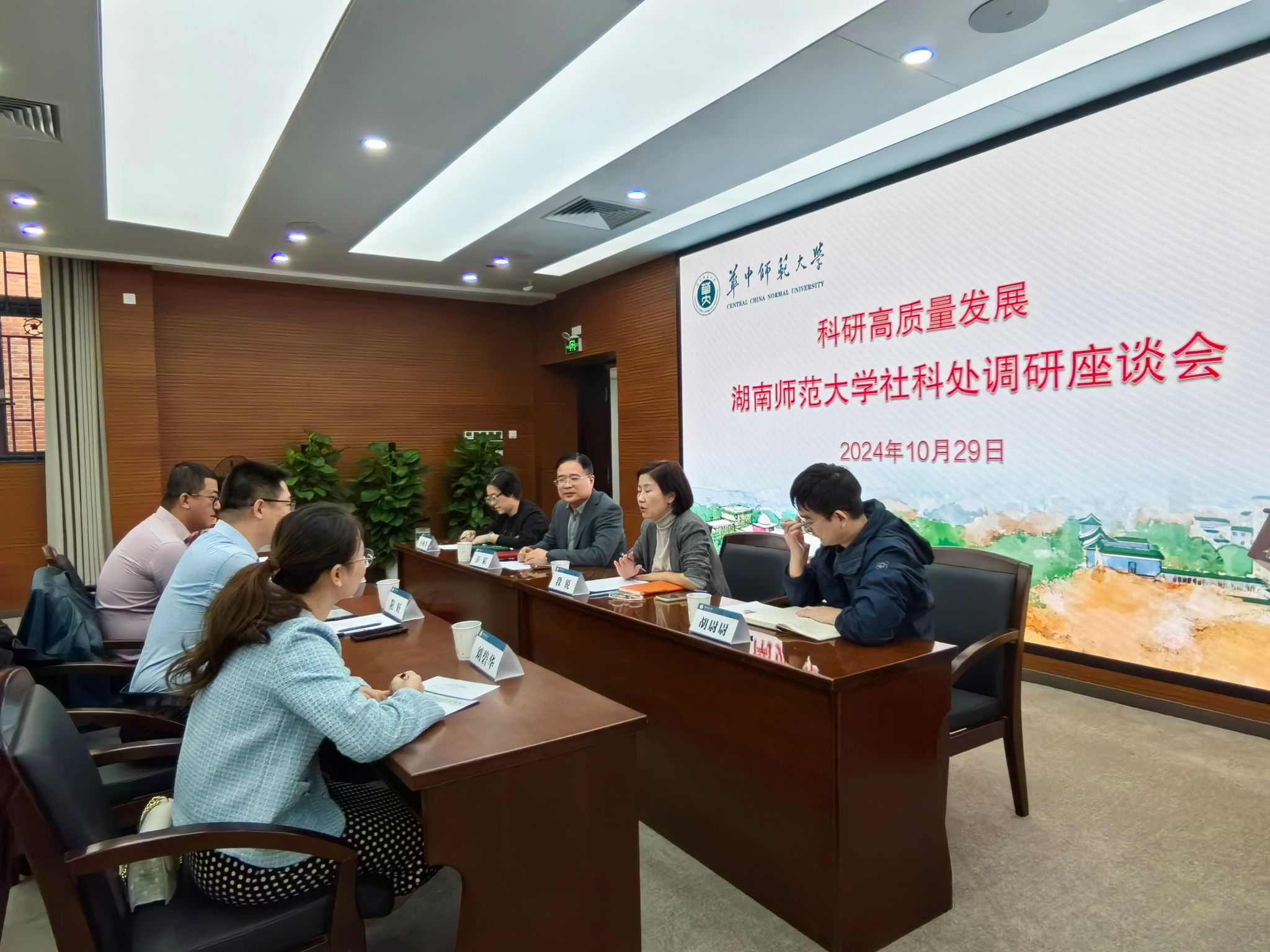 随后,调研组与华中师范大学社科处围绕高层次科研项目申报与管理、标志性科研成果培育、平台与智库建设等方面进行深入交流,共同探讨推动高校哲学社会科学高质量发展的有效之策。